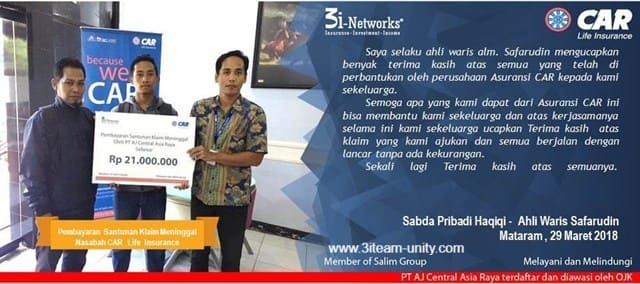 Testimoni Klaim Asuransi CAR 3i Networks Testimoni Klaim Pencairan Asuransi Jiwa CAR 3i NetworksTestimoni dan Bukti Klaim Nasabah CAR 3i NetworksGRATIS WEB REPLIKA + WEB BISNIS 3I-NETWORKSSumber: http://www.car.co.id/id/layanan-nasabah/individu/testimony